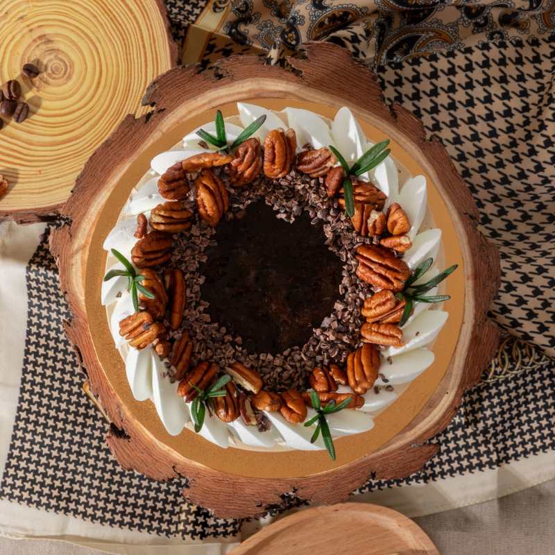 Decoration: Dark Roast Espresso Coulis, Roasted Crunchy Pecan Nut, Callebaut Crispy Cocoa Nibs