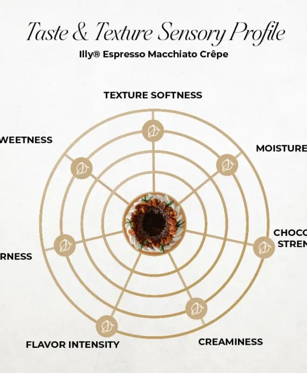 Illy® Espresso Macchiato Crêpe features a delicate Madagascar vanilla crêpe layered with Illy® Arabica with Dark Roast Robusta yogurt crémeux, then filled with jelly made from the same coffee, offering a perfect harmony of silky texture and bold espresso aroma.