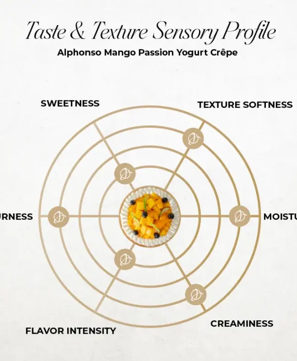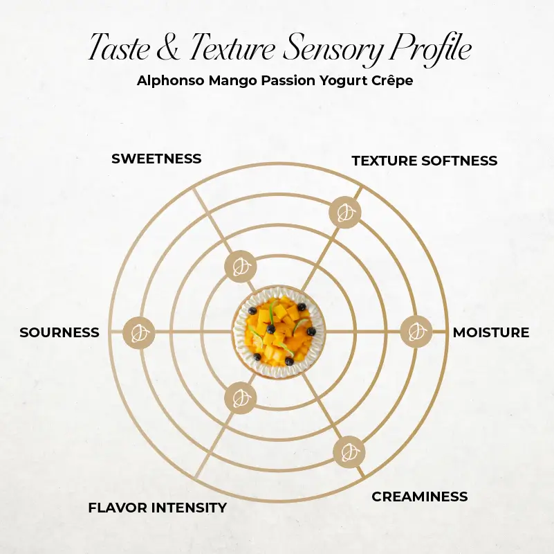 Tropical indulgence meets creamy elegance in our Alphonso Mango Passion Yogurt Crêpe — crafted with delicate Madagascar vanilla crêpes layered with smooth Madagascar vanilla yogurt crèmeux, and filled with vibrant Alphonso mango jelly and tangy Panama passion fruit compote. A refreshing burst of fruit-forward flavor in every silky bite.